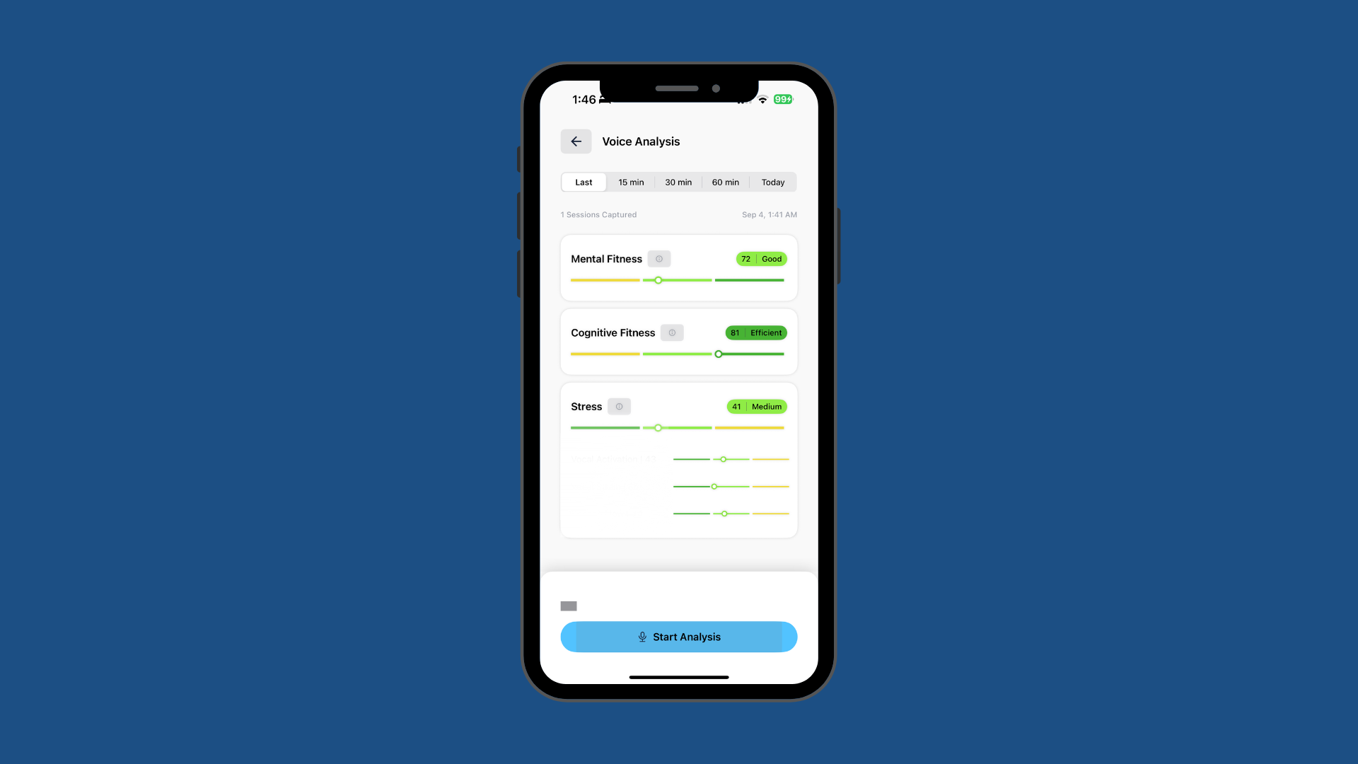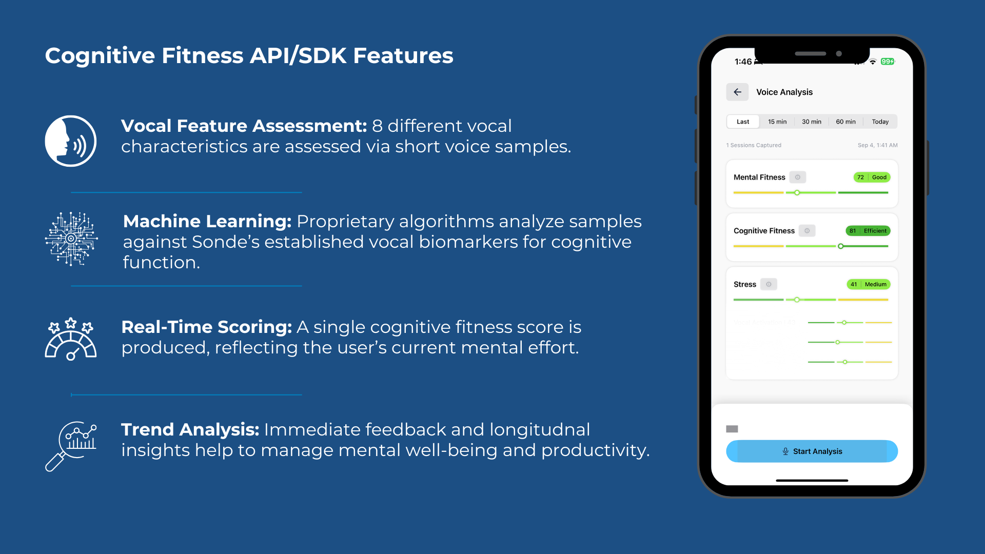 Our CF product uses everyday devices like smartphones to analyze vocal patterns. It looks at both acoustic and prosodic features to generate a single score that reflects cognitive state, offering insights to support mental well-being and productivity.