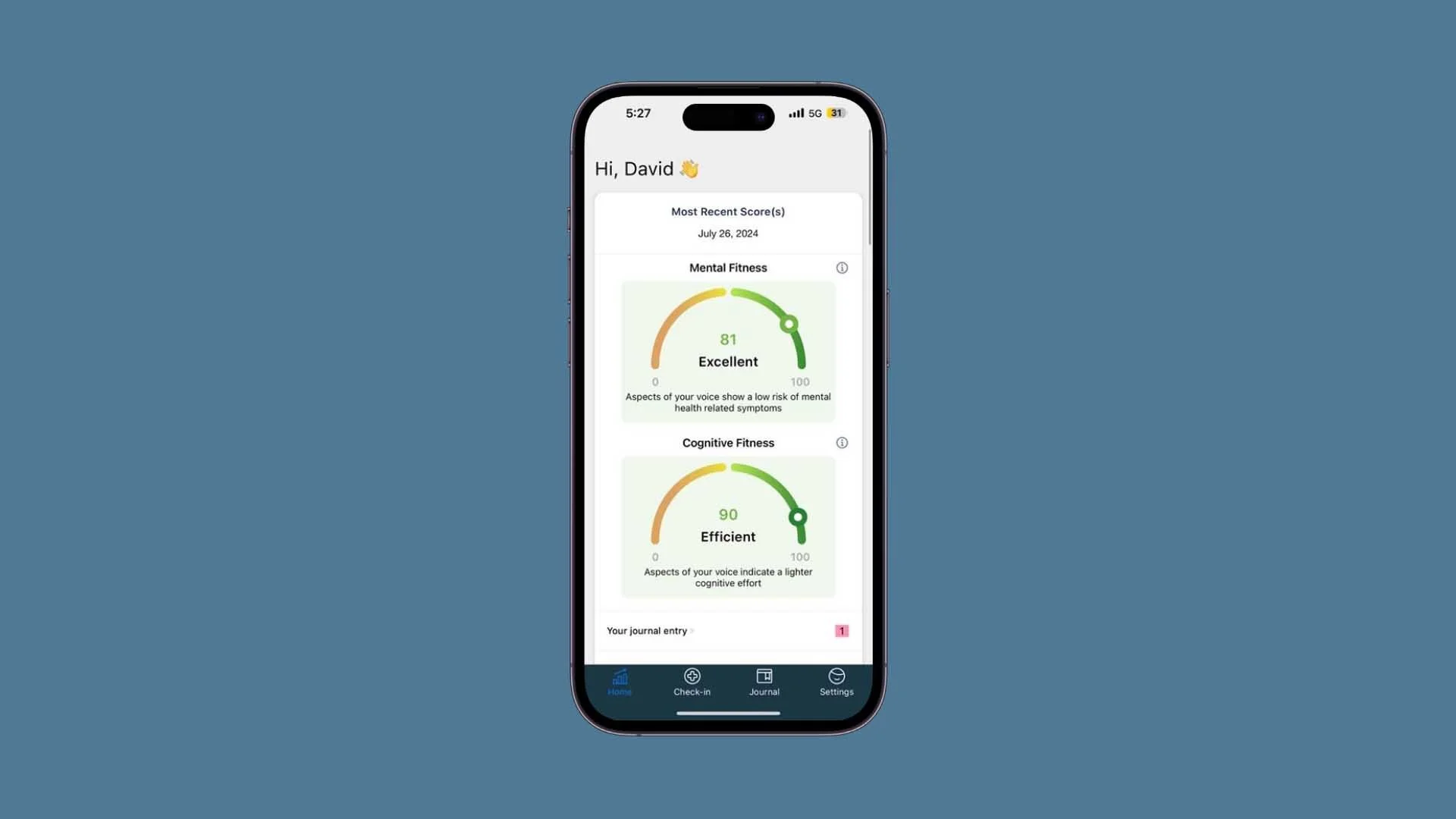 Our CF product uses everyday devices like smartphones to analyze vocal patterns. It looks at both acoustic and prosodic features to generate a single score that reflects cognitive state, offering insights to support mental well-being and productivity.