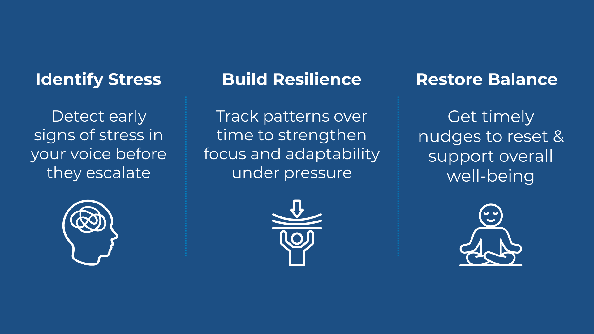 Sonde’s Stress Biomarker transforms everyday speech into a real-time measure of your body’s stress response. By analyzing subtle shifts in tone, strain, and speech flow, Sonde helps you stay aware of stress levels before they take a toll on your well-being or performance.